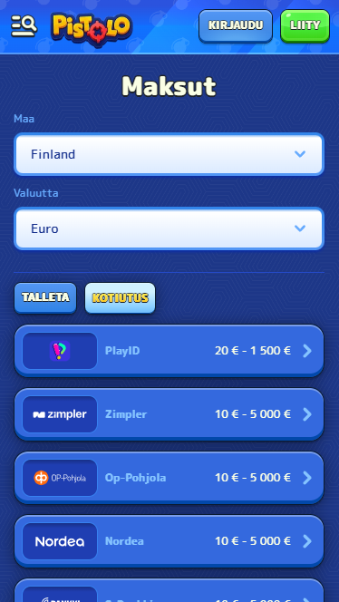 | Maksut Suomessa | PlayID, Zimpler, OP, Nordea, S-Pankki, Danske Bank, Aktia, POP Pankki, Ålandsbanken jne. (tyypilliset rajat 10–5 000 €) |