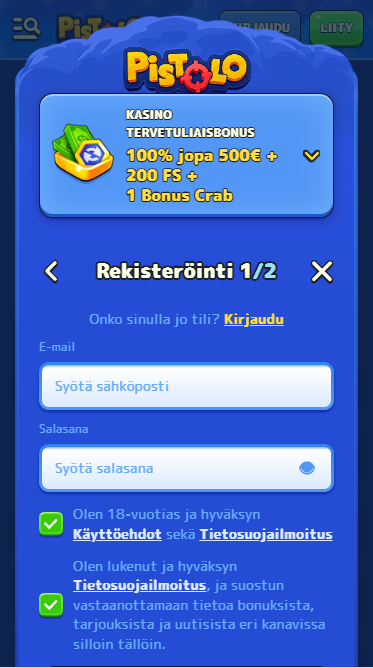 Vahvista, että olet 18+, ja hyväksy Käyttöehdot sekä Tietosuojaseloste.